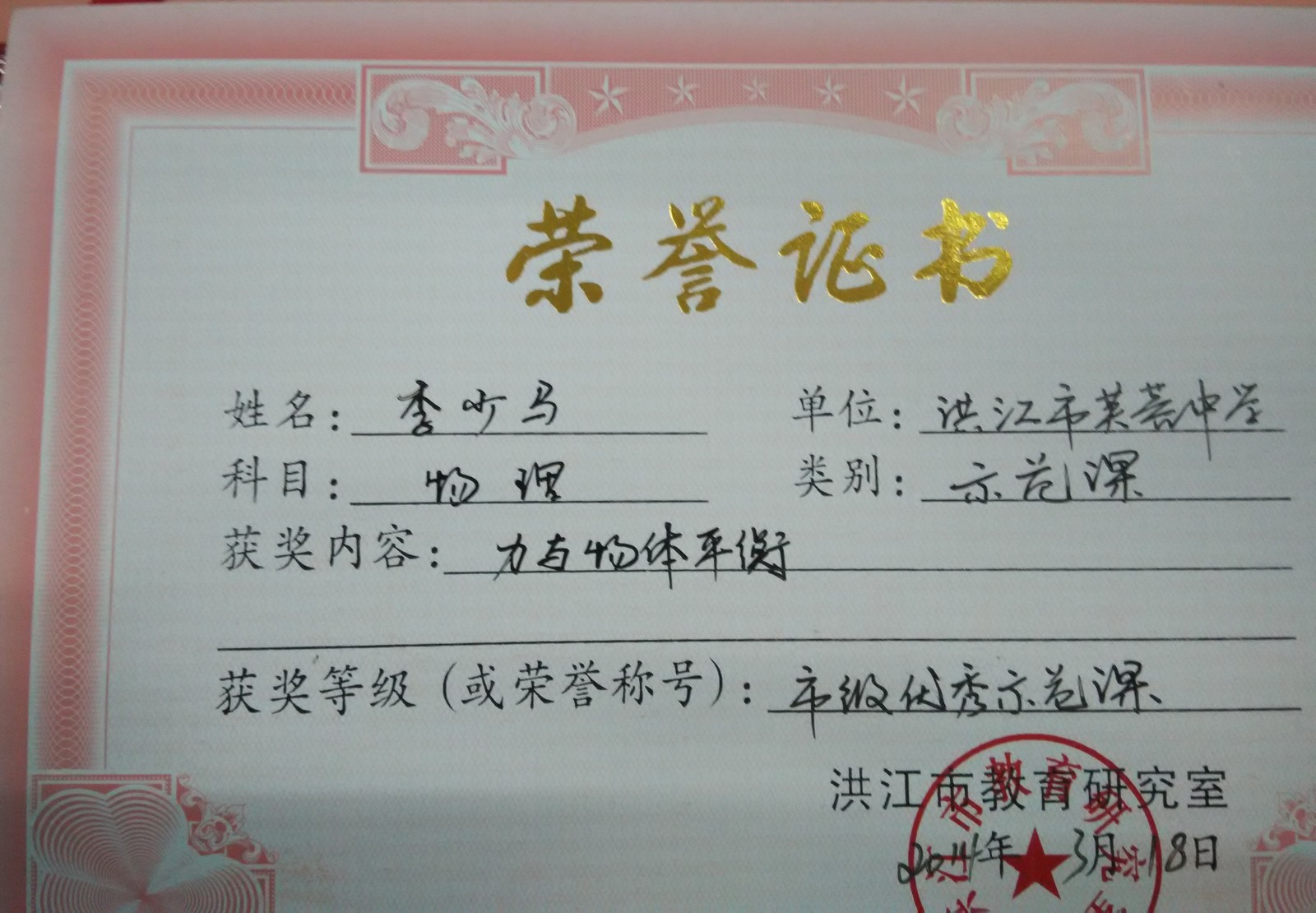 洪江市实验创新大赛一等奖