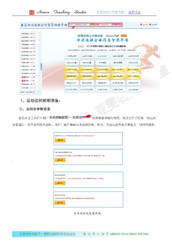 亚雯名师工作室文档 返回目录 1、运动会的前期准备: ①、运动会参数设置 首先点击工具栏左侧 处将数据初始化处理,此项工作只在每一次运动 会前进行,清空原有的代表队、项目、报名数据以及成绩信息。所以,当运动会有报名数据后,请谨慎操作。 系统初始化处理界面 让您轻松体验不一样的互联网 田径运动会 第 12 页 共 20 页 ARWEN TEACHING STUDIO +