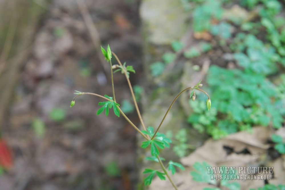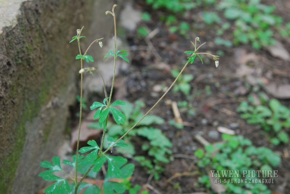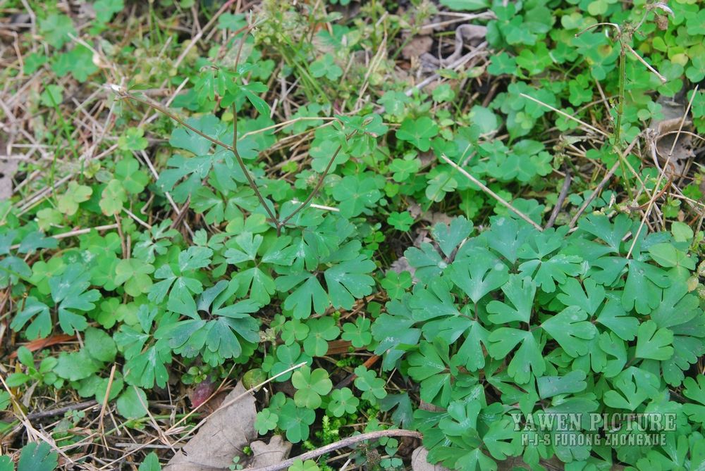 分布中国西南、华东、多年生小草本。 块根长1-2厘米,粗3-6毫米,外皮棕黑色。茎1-5条,高10-32厘米,直径1-2毫米,被稀疏的白色柔毛,分歧。基生叶多数,为掌状三出复叶;叶片轮廓卵圆形至肾形,长1.2-3厘米;小叶扇状菱形或倒卵状菱形,长0.6-2.5厘米,宽1-2.8厘米,三深裂,深裂片又有2-3个小裂片,两面均无毛;叶柄长3-12厘米,基部扩大呈鞘状。茎生叶与基生叶相似,惟较小。