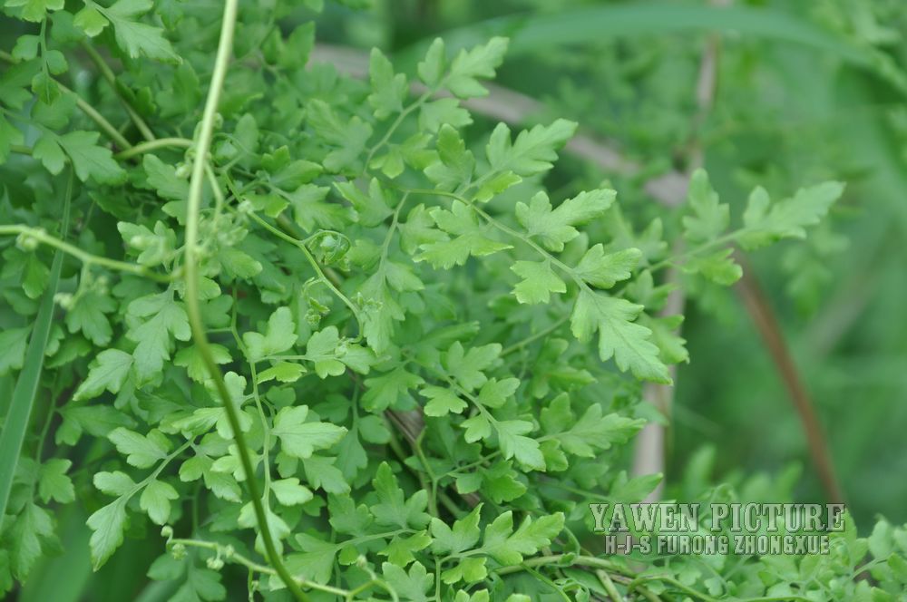 多年生草质藤本,长1~5m。根状茎横走,生黑褐色有节的毛;根须状,黑褐色,坚韧,亦被毛。叶多数,对生于茎上的短枝两侧,二型,纸质,连同叶轴和羽轴有疏短毛:营养叶尖三角形,长、宽各10~300px,二回羽状,小羽片掌壮或3裂,宽3~8mm,边缘有不整齐的细钝锯齿,孢子叶卵状三角形,长、宽各10~500px,多收缩而呈深撕裂状。夏末,小羽片下面边缘生流苏状的孢子囊穗,穗长2~5mm,黑褐色,孢子表面有小疣。