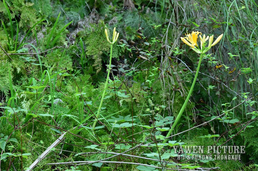 花茎高约60厘米;总苞片2枚,披针形,长约3.5 厘米,宽约0.8厘米;伞形花序有花4-8朵;花黄色;花被裂片背面具淡绿色中肋,倒披针形,长约 6厘米,宽约1厘米,强度反卷和皱缩,花被筒长1.2-1.5厘米;雄蕊略伸出于花被外,比花被长1/6左右,花丝黄色;花柱上部玫瑰红色。